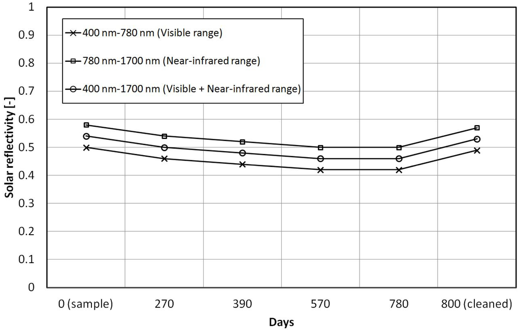 The result showed that the solar reflectivity decreased about 0.08 after 780 days of exposure in the outdoor environment for all three wavelength ranges. However, the solar reflectivity almost recovered to the initial value when the surface was cleaned with distilled water. Thus, the dirt accumulated on the surface is considered as the main cause of the decrease the solar reflectivity. This also indicates that there is no surface degradation over the 780 day period.