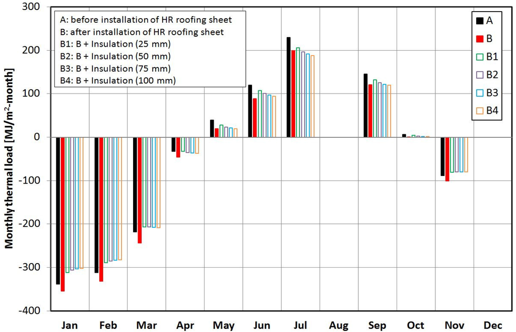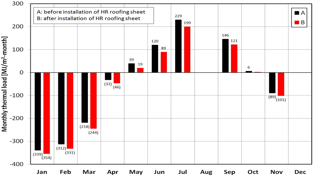- The thermal load from May to October (note that September is summer vacation for the school) decreased when the roof was covered with the HR roofing sheets (Case B). Among these months, July had the largest reduction of monthly cooling load, about 30 MJ/m2/month.