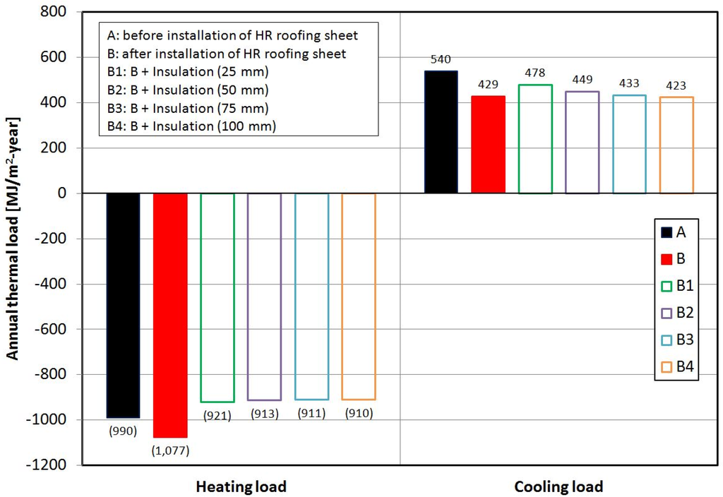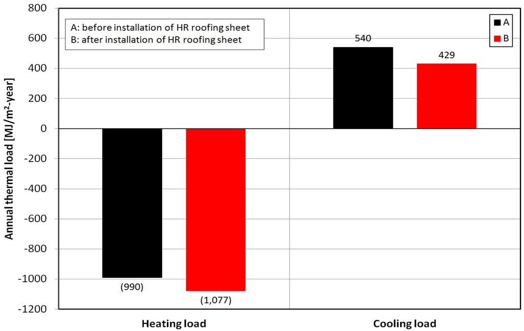 - Compared to the case without the HR roofing sheets (Case A), annual total thermal loads decreased about 25 MJ/m2/year, and the cooling load decreased about 112 MJ/m2/year with the HR roofing sheets (Case B). However, annual heating load increased about 87 MJ/m2/year with HR roofing sheets (Case B).