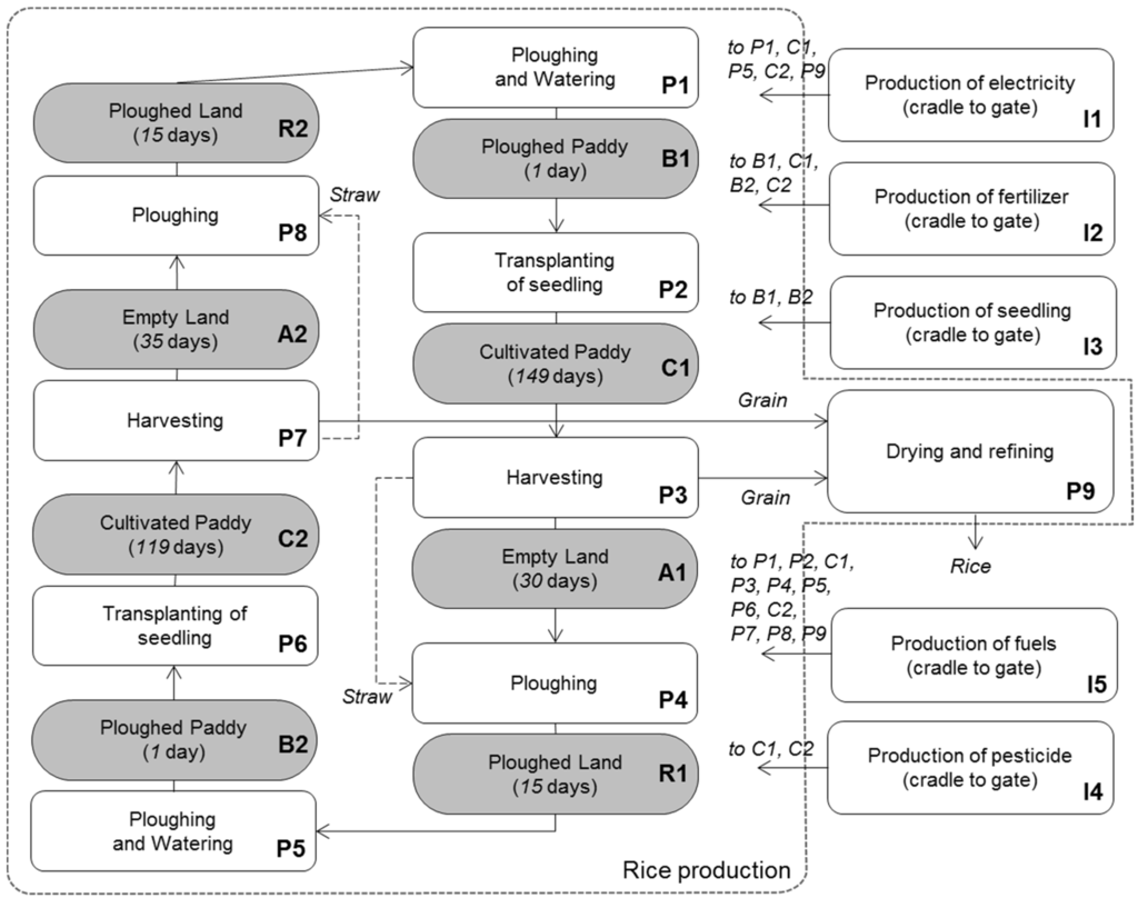 The scope of the study (Figure 1) includes the agricultural processes (i.e., ploughing, watering, seedling transplanting, farm management activities, such as fertilizing and pesticide spraying, and harvesting) and post-harvest processes (i.e., drying and refining). The farm management activities were not shown as an individual process, but were included in cultivation (C) boxes. I boxes show the inputs of the system. P boxes represent the processes involved. B, C, A and R boxes represent the status of the paddies, where B means before cultivation, C means cultivation, A means after cultivation and R means with residues (rice straw) as green manure. Transportation of fertilizer, pesticide and machinery from stores or suppliers to farms was included, but the transportation of fertilizer and pesticide from factory to stores, grains from farms to mill factory and rice from mill factory to consumers was excluded from the scope of the study.