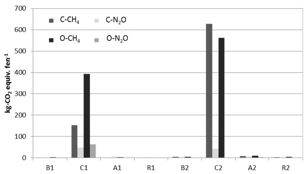 Emission factors of CH4 measured in southwestern Taiwan were used to calculate the emissions of conventional farms. The factors were determined by Huang et al. [62] based on measurements during the first and second CS (periods B and C) at 6 a.m. and 12 p.m. and were computed using the summation of CH4 emission in the different sampling stages of rice plants [62]. There was no data available for the A and R periods. Therefore, we used the factors determined during the first and second CS when they were left fallow (no rice cultivated) [62] and modified with the length of the period (see the footnotes of Table 6), because both the A and R periods and the fallowed B and C periods were not flooded with water. The measured N2O emission factors in southwestern Taiwan are also only available during the first and second CS [63], but not the A and R periods. The N2O emission rates were determined by Yang et al. [63] at a 0.5-h interval for 1.0 h by measuring the changes of N2O concentrations (the net change between N2O emission and sink) in the acrylic chamber. The emission factors for the A and R periods were from the measurement in western Taiwan [64] instead. This measurement was made during A2 and R2, but could represent the emission from A1 and R1, as well, because the soil nitrogen content is relatively low in all of these periods [65].