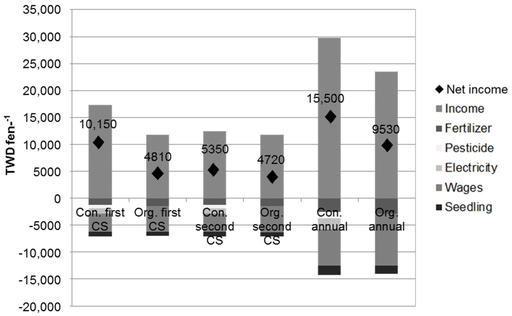 Here, the environmental and economic aspects of organic and conventional rice production in tropical monsoon Asia with a dual cropping system are assessed based on case studies in Taiwan. No judgement is made about whether organic or conventional rice production is better, because assessing only some of the impacts might not reflect the overall sustainability of the systems [20]. Instead, the reasons for the differences exhibited by these two farming methods are discussed via life-cycle assessment (LCA) and the interviews conducted.