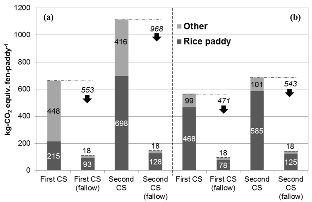 The CH4 emission of the C period for conventional farms in Houbi and organic farms in Luoshan was calculated based on data reported by Huang et al. [62] and Peng et al. [67], respectively. Peng et al. [67] reported that CH4 emission becomes higher when the amount of N application is higher. However, during the first CS, the N application from Huang et al. [62] was higher (140 kg·N·ha−1·CS−1) than from Peng et al. (120 and 90 kg·N·ha−1 for the first and second CS, respectively). Therefore, we assumed that the difference was probably due to the different climate conditions, soil properties and the growth of rice.
