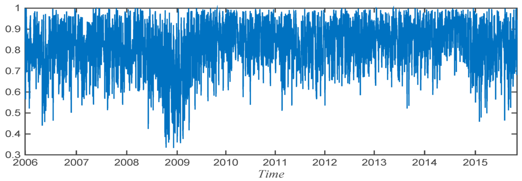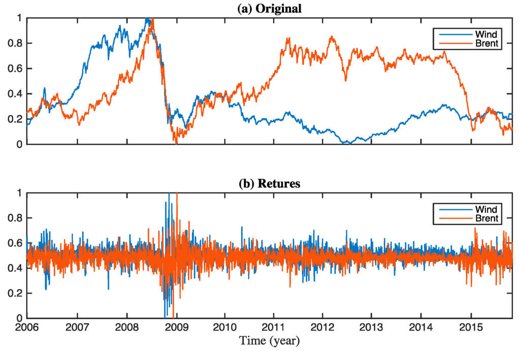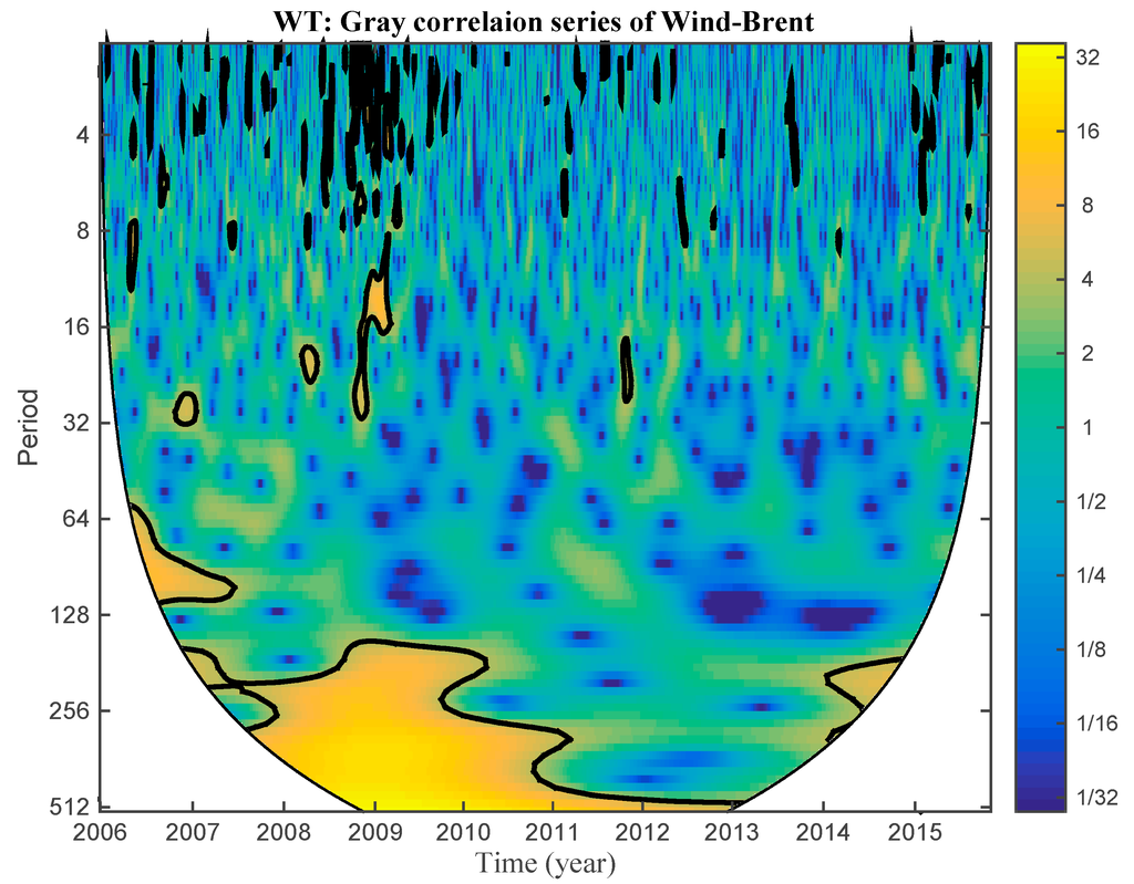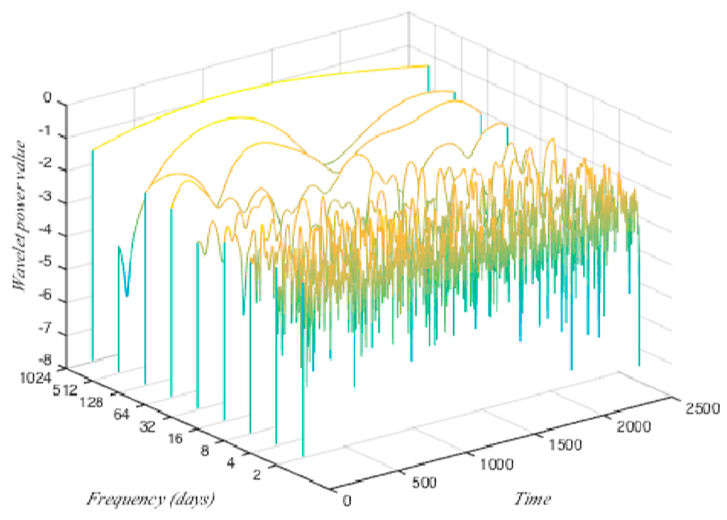 - The discretization of the wavelet power spectrum. The wavelet power spectrum shows a clearer picture of the fluctuation of the correlation of Brent–wind in detail. The frequency band of the wavelet power spectrum is continuous and rings from 2 to 512 days. Here, we choose the frequency band of 2 days, 4 days, 8 days, 16 days, 32 days, 64 days, 128 days, 256 days, and 512 days as the backbone to stand for the entire continuous frequency band according to the discretization method of the discrete wavelet transform. As mentioned, the wavelet power spectrum is a n*m matrix, where n is the number of frequency bands that constitute the continuous frequency band, and m is the number of data points. After the discretization we obtain a new matrix, the size of which is 9*m. We normalize the discretized wavelet power spectrum matrix through the logarithmic transform.
