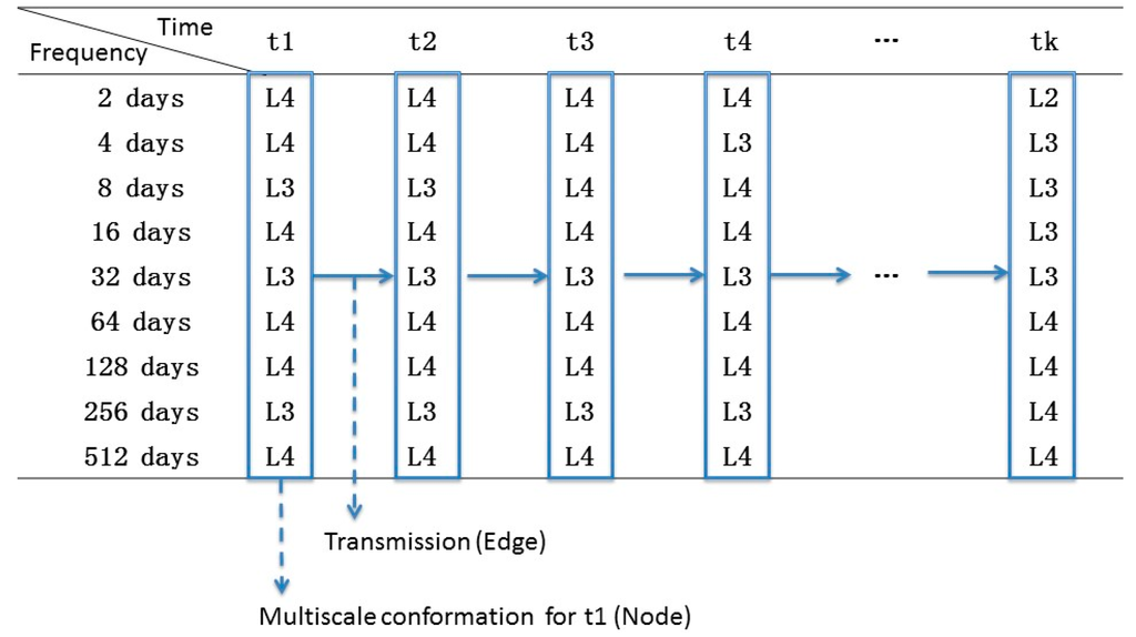 - The definition of the multiscale conformation. First, we divide the values of the discretized wavelet power spectrum into four levels according to its maximum and minimum and divide the value ranges from the minimum to the maximum into four equal intervals. We also use L1, L2, L3, and L4, which mean the fluctuation is very weak, weak, high, and very high, respectively. For each time point, there are nine components from different time horizons, and the combination of them can determine the status of the original Brent–wind correlation. Here, we define the multiscale combination of nine time scales at one time point as the multiscale conformation.