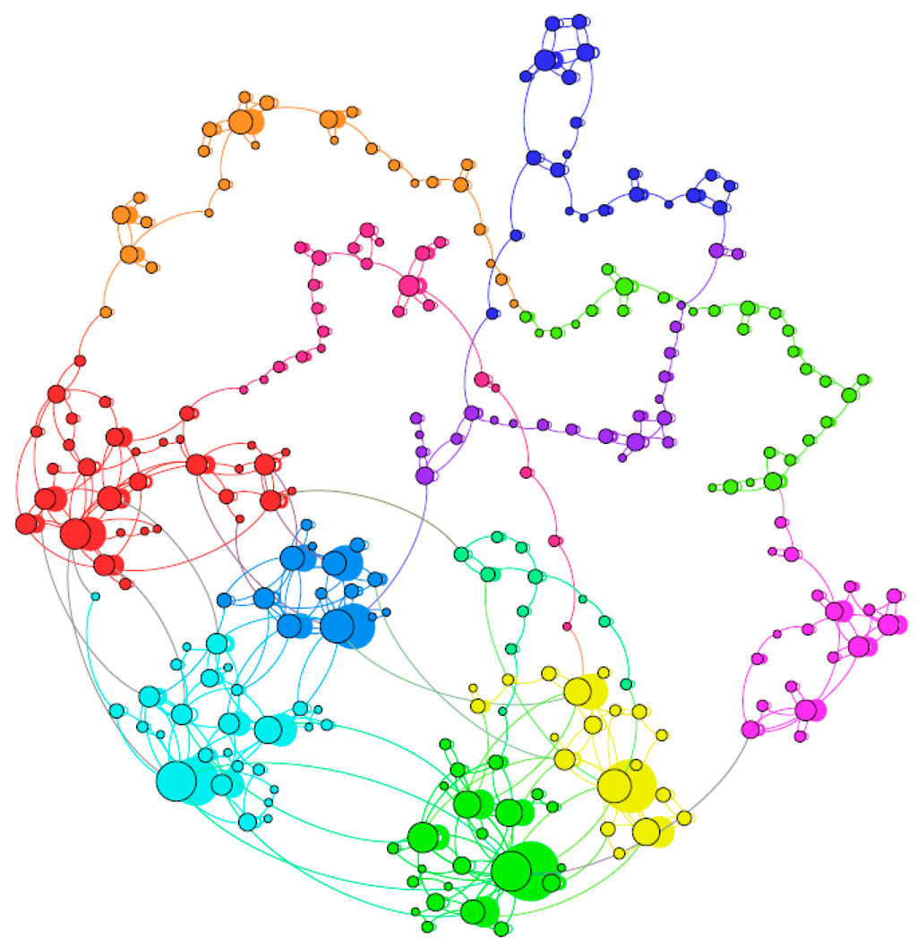- Blondel, V.D.; Guillaume, J.L.; Lambiotte, R.; Lefebvre, E. Fast unfolding of community hierarchies in large networks. J. Stat. Mech. 2008. [Google Scholar] [CrossRef]