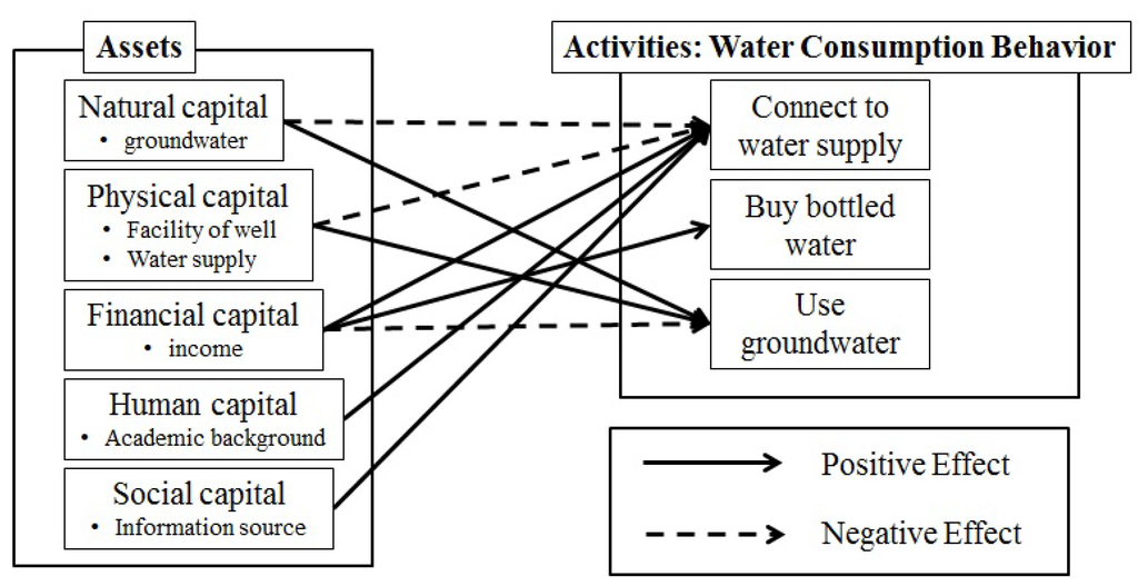 Results revealed that richer natural and physical capital delayed connections to the water supply, and greater financial capital stimulated the purchase of high-quality water rather than simply a connection to the water supply. In terms of human capital, there was a greater tendency for bigger families to connect to the water supply when compared to nuclear families. Social capital seemed to play a role in helping households cooperate with each other and to work well together in the survey area. As stated above, this study confirmed that a variety of factors involved in each form of capital affected residents’ thought processes regarding water consumption behaviors.