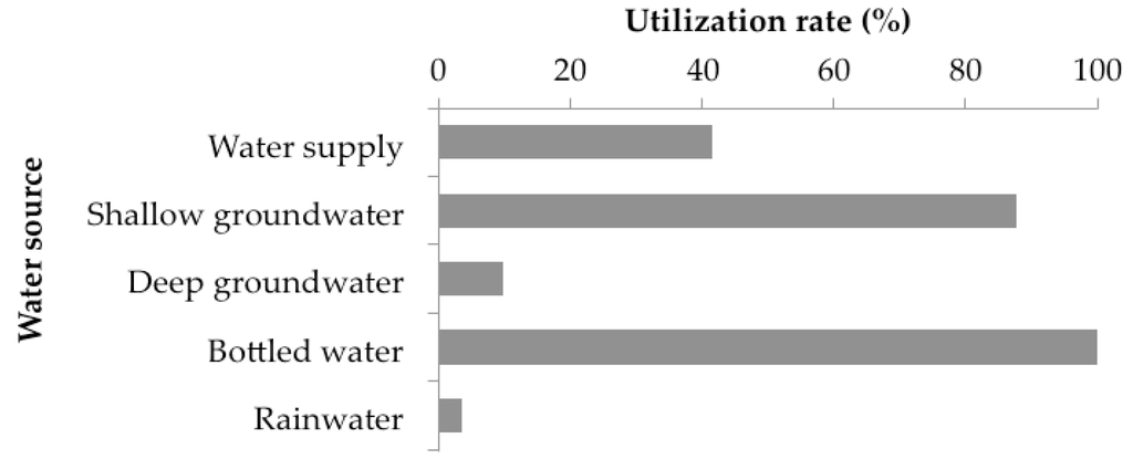 Without reliable access to an adequate and stable supply of water, residents usually have various sources of water to avoid the risk posed by the unavailability of a single source []. Suburban Vientiane is no exception. Many sources of water are used: the water supply, groundwater, bottled water, river water, and rainwater. The pattern of water usage differs somewhat among the households. Most households generally used water from two or three sources.