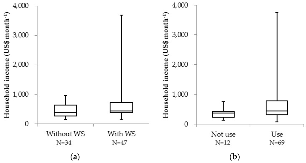 The association of household income with a connection to the water supply was assessed. Two clusters of household income are shown in Figure 6a; one cluster is the income distribution of households who have a supply of water, the other is the income distribution of households who do not. We applied the Mann–Whitney U-test [], which is a non-parametric test that can be used effectively for small samples [], to determine the significance of the difference between the two clusters’ mean household incomes. Results of the U-test showed no significant difference between the two clusters, indicating that a connection to the water supply was not related to household income. This was interpreted as indicating that residents did not necessarily install the water supply, even if it provided an adequate quantity of water and they could afford it. On the other hand, quality of water was compared to the income of households using or not using bottled water for cooking; the distribution is shown in Figure 6b. Here, there was a significant difference between the two clusters.