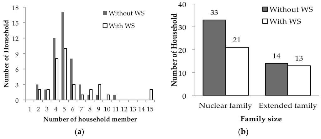 As for the latter variable, namely the quantity of human capital, according to Figure 7a, households with a large number of members tended to connect to the water supply. Welch’s t-test, performed to examine this tendency, showed that it was significant (p = 0.07). Subsequently, we separated the households into two categories: nuclear family and extended family. The definition of a nuclear family was a household composed of one or two generations, for example, parents and their children; an extended family was defined as a household composed of three or more generations. Figure 7b shows the results. Extended families were more likely to connect to the water supply compared to nuclear families.