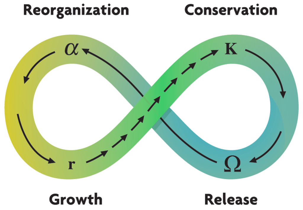 Holling [39] illustrated these dynamics as an “adaptive cycle”, a description that should be thought of as a metaphor, a heuristic or conceptual model that can facilitate the understanding of complex systems, including organizations (see Figure 1). Initially, it was used to study the dynamics of ecosystems where ecologists had observed that periods of exploitation, for example, the rapid growth that follows a forest fire, were followed by periods of slower growth and accumulation of energy and structure. The adaptive cycle added the release and reorganization phases.