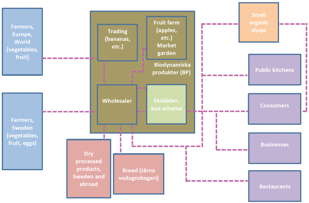 Biodynamiska Produkter (Biodynamic Products; BP) is a not-for-profit foundation “providing consumers with organic and biodynamic food of high quality, in a way that enables farmers to continue developing” [43]. This dual aim is meant to provide favorable long-term conditions for organic/biodynamic farmers. BP consists of four parts: a fruit and vegetable box scheme (Ekolådan), a wholesaler, a trading company and two production units (an organic fruit farm and an organic market garden in Sweden). BP is a fully-certified organic business situated in Järna, 40 kilometers southwest of Stockholm. This area is the most important anthroposophic cluster in Sweden, of which BP has been an integral part since its start in 1966. Anthroposophy is based on the philosophical teachings of Rudolf Steiner (b. 1861, Austria) and entails biodynamic agriculture, education, healthcare and more. Järna today is the anthroposophical center of all the Nordic countries. Anthroposophically-inspired businesses and organizations in Järna include Waldorf Schools and the Steiner College, the Vidar Clinic, Ekobanken (a not-for-profit bank), several farms and market gardens, food-processing concerns (e.g., Saltå Kvarn) and food distributors, including BP. The trading division of BP co-operates with similar organic mid-scale initiatives in Europe that together (i.e., not in the conventional retail network) source items, such as coffee, bananas and other fruits from overseas. Since these products come to ports in the Netherlands, BP has one employee there, as well. The wholesaler, which supplies restaurants, kitchens, organic shops and its own box scheme, buys all produce and processed products from Sweden, Europe and overseas.