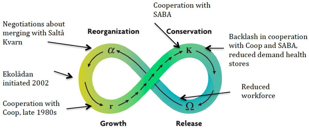 Figure 1 illustrates how longer periods of stability and the slow accumulation of resources alternate with shorter periods of turbulence [40]. Periods of turbulence are characterized by rapid reorganization and are sometimes used to illustrate what Schumpeter [41] called creative destruction, when turbulence breaks down structures, in turn creating opportunities for innovation. During the reorganization phase in Figure 1, there is a possibility that the organization might transform and take an unexpected turn and develop in a new direction. This phase is unpredictable, and there is a risk that capital could be drained. The adaptive cycle can be applied to different systems and different scales. Resilience at a higher scale, e.g., a large corporation, may require transformations of smaller units of this corporation, just like resilience of the biosphere requires transformation of the food and energy systems [42]. The adaptive cycle is used below to illustrate periods of growth and crisis in an organically-certified business in Sweden.