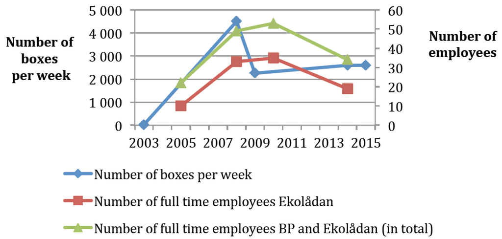 The number of boxes delivered weekly and the number of BP and Ekolådan employees. Sources: R2 (2003 and 2009), R1 (2008 and 2014), R5 (2015).