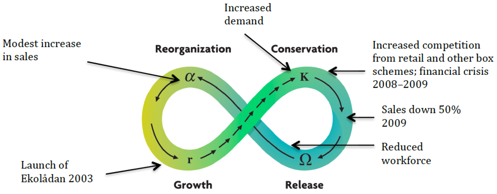 In a socio-economic system, accumulated capital (e.g., skills, productivity, networks, mutual trust) is developed and integrated during the progression from r to K in an adaptive cycle (e.g., Figure 1) [40]. Farmers delivering products to Ekolådan considered themselves fairly economically diversified, relatively stable and well prepared to tackle change and turbulence [53]. In terms of Figure 1, they have moved from r to K. If or when change arises, the supplying farmers are thus arguably prepared to handle the release phase in Ω. Of interest for the development of Ekolådan and BP is, of course, the larger development of organic food in Sweden. In the period 2008–2014, the total increase in sales amounted to more than 150%, and demand increased steadily even during the financial crisis [54]. During the last few years, demand has increased at an accelerating rate. In 2013, the increase was 13% [55]; in 2014, it was 38% [56]; and in 2015, the increase in organic sales was 39% [57]. This can be contrasted with the development of Ekolådan: sales have increased by 16% from 2009 to today. This result is somewhat contradictory. On the one hand, it is a sign of an increased interest in BP’s and Ekolådan’s products (organic food), and BP has clearly played an important role in the market’s development in Sweden. On the other hand, BP has not managed to capitalize on this increased demand to which it has contributed. Our results suggest that this is due to a combination of competition from conventional retail, the cautious attitude internally and the difficulty BP has in reaching consumers who now face multiple organic options. The growth in the number of delivered boxes suggests that Ekolådan has consolidated and recovered from the 2009 crisis. However, Ekolådan underperforms vis-à-vis the market and is vulnerable to new competition since the concept is easy to copy.