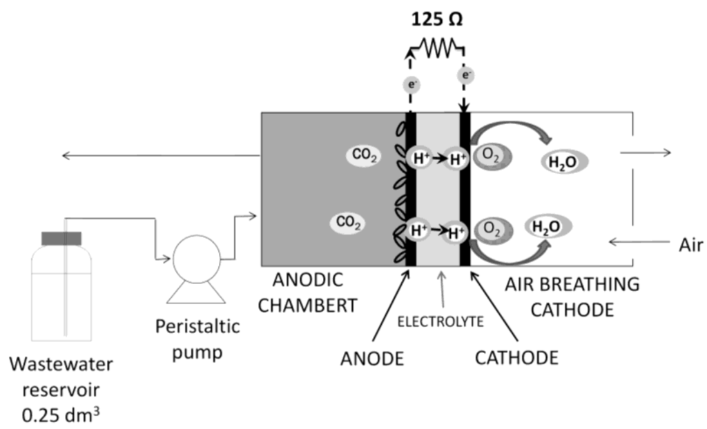 The microorganisms that power MFC can oxidize a diverse range of “dirty” fuels that are often of little perceived value. Amongst these dirty fuels, organic waste, organic matter contained in soils and sediments, compost, etc., can be found [,]. Because of that, one of the most attractive energy sources for MFCs is wastewater, mainly because electricity production could be combined with wastewater treatment [,]. The use of MFCs for wastewater treatment presents several advantages, such as savings in aeration and solids handling. The aeration process account for half of the operation costs at a typical treatment plant [] but it is not necessary in MFC. Moreover, the MFC process is inherently an anaerobic process, the sludge yields for an anaerobic process are approximately one-fifth of that for an aerobic process []. Thus, using MFCs could drastically reduce solids production at a wastewater treatment plant, substantially reducing operating costs for solids handling [].