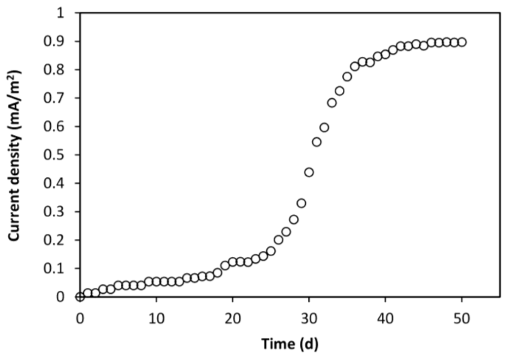 In order to establish reference values for electricity generation in the MFC, the set-up was inoculated and operated for several weeks without oxidized nitrogen addition. Once the steady-state was reached, the system was operated for four weeks in order to evaluate the stability of the system. During these weeks, the current density exerted was about 0.9 ± 0.05 mA·m−2 (see Figure 2).