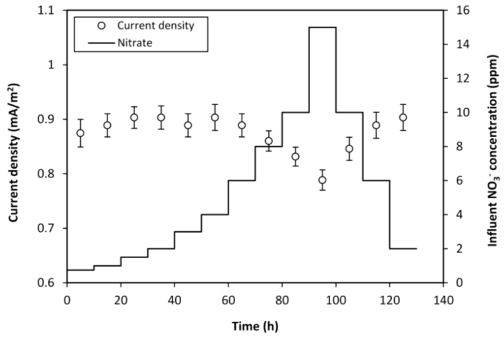 From the obtained results, it must be stated that no hysteresis was observed in the behavior of the system. As can be seen in Figure 3, the exerted current density for the same influent nitrate concentration was the same in the forward and in the reverse scan. This result indicates that short-term exposition to external electron acceptors does not modify the response of the system once the perturbation is finished.