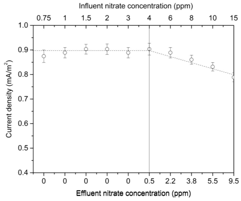 As can be seen in Figure 4, when the effluent nitrate concentration was negligible the exerted current density remained unaffected. This corresponds to influent nitrate solutions ranging from 0 to 4 ppm as was previously indicated in Figure 3. However, when the influent nitrate concentration was higher than 4 ppm, the availability of the nitrates in the anodic chamber generated a pure anoxic environment characterized by full availability of the electron acceptor. In these conditions, the nitrate was always present, which affected the electrical performance of the MFC. The reduction of the voltage exerted was about 0.013 mA·m−2 per ppm of NO3− present in the MFC.
