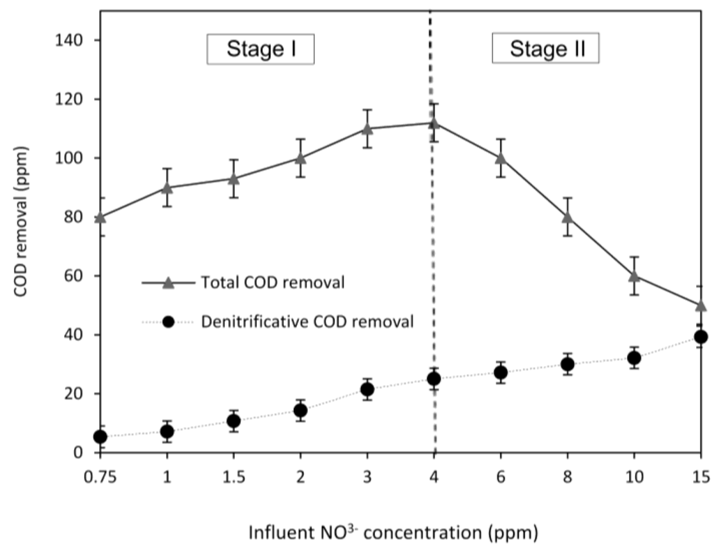 In order to study the substrate removal coupled to the denitrification process, the COD consumption due to the denitrification process was calculated according to the equation proposed in the literature [].
