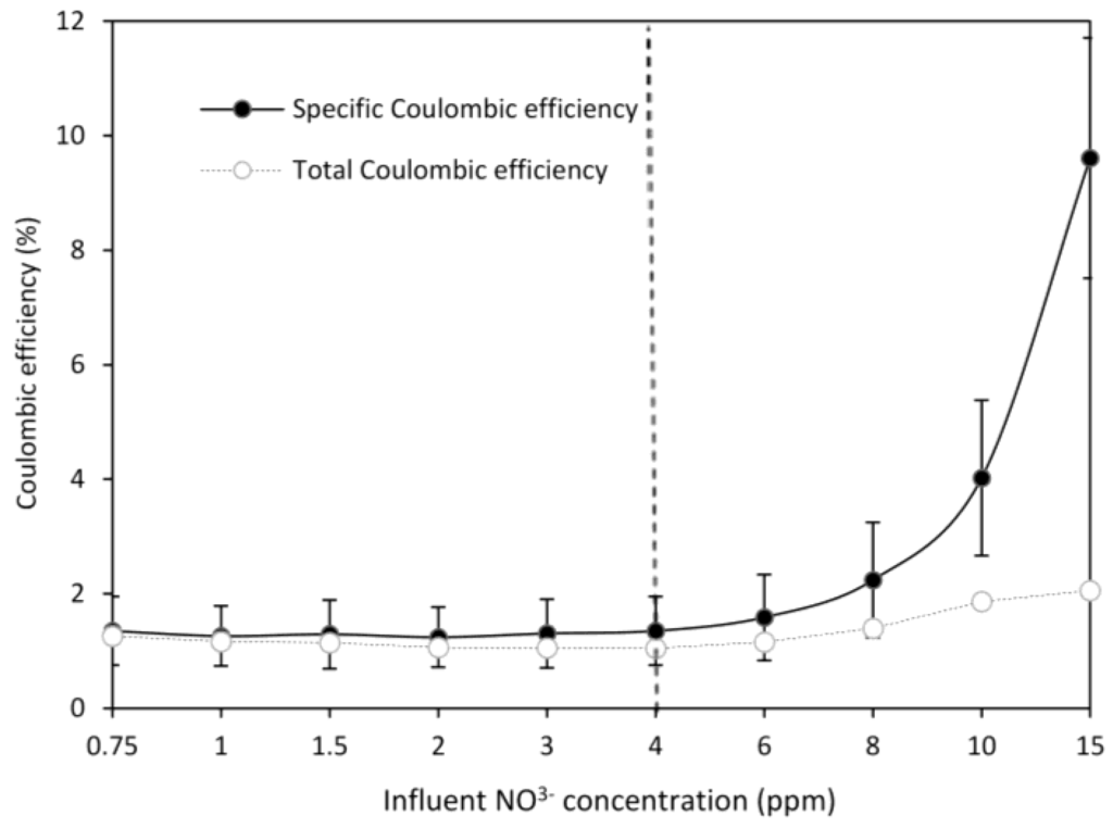 In addition to the effect of the influent nitrates over the conventional anaerobic processes, a possible effect on the electrogenic processes could also be possible. In order to study that, the coulombic efficiency was determined for each influent nitrate concentration. The Coulombic efficiency obtained is presented in Figure 6.