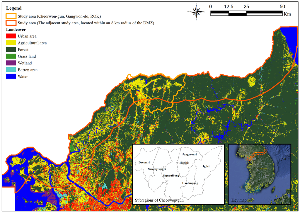 This study was conducted from October 2009 to March 2010 and covered the wintering season of the red-crowned crane. Since Cheorwon-gun has large CCZs and DMZs, the ROK government granted permission to run field surveys. Two areas were selected: one was Cheorwon-gun, Gangwon-do (ROK), an important wintering area for red-crowned cranes (Figure 1). A habitat suitability model was established and habitat characteristics were analyzed for red-crowned cranes wintering in this area, which was also used for crane presence data collection. For the purpose of finding alternative crane wintering habitats, a second study area was selected within an 8 km radius of the DMZ (Figure 1). Owing to the strict military security regulations there, this area was seldom affected by development.