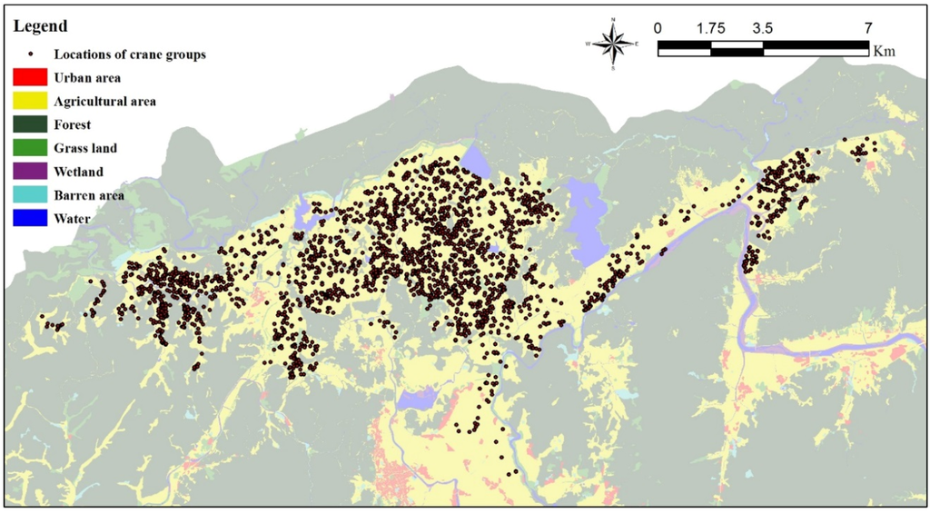 Crane habitat preference is related to food availability [19], disturbance agents [20,21], and sleeping places [22]. Research on crane sleeping sites is limited since nocturnal access to this area is restricted. On the other hand, there are many studies on food resources in the area. Cranes prefer rice paddies with abundant grain and are affected by disturbance factors such as automobile traffic.