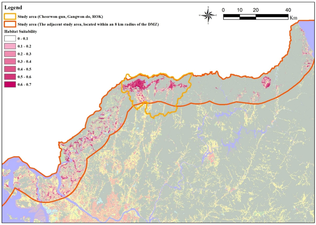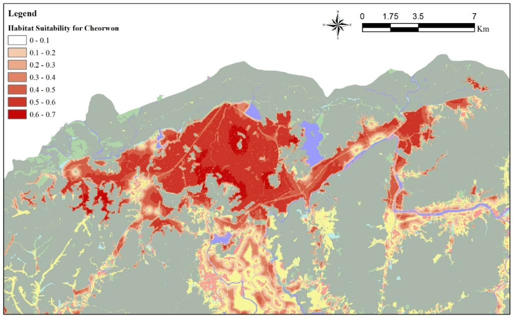 The selected target species is the red-crowned crane (Grus japonensis). It is the most highly endangered of the genus. First, we reviewed earlier studies on red-crowned cranes and methods of evaluating habitat suitability. We then gathered red-crowned crane presence data and selected and optimized the model for the Cheorwon-gun area. Next, we mapped and analyzed Cheorwon-gun habitats. We also assessed other areas near the DMZs as potential alternative red-crowned crane habitats. Finally, we proposed a conceptual diagram to support a conservation plan and prevent the negative effects of development on the red-crowned crane.