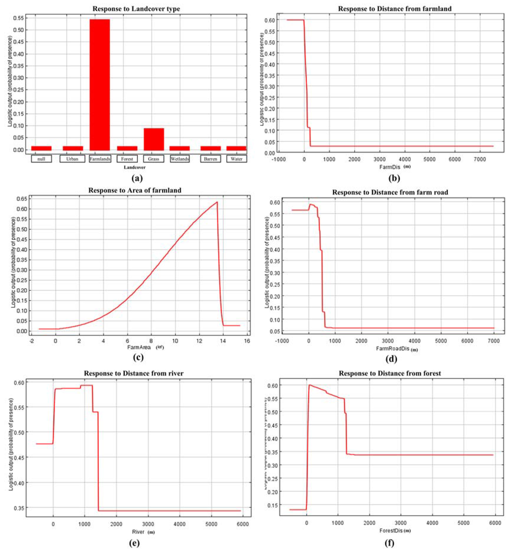 Logistic output (probability of presence) of the model in response to different variables. (a) response to different land cover types; (b) response to distance from farmland; (c) response to distance from unpaved roads; (d) response to distance from rivers; (e) response to distance from forests; and (f) response to farmland area.