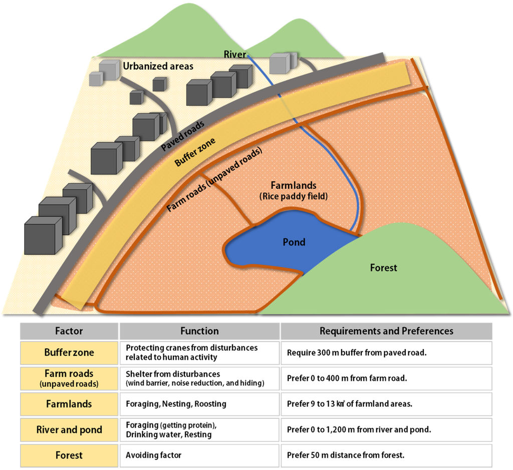 Based on the information derived from the habitat suitability model, a conceptual diagram that factored in the characteristics of Cheorwon-gun was made to support the establishment of a conservation plan for preferred crane areas (Figure 6). Nevertheless, areas within an 8 km radius of the DMZ resembled Cheorwon-gun, so this diagram may be applied to other potential crane habitats. The diagram emphasizes the function, requirements, and preferences of the various factors related to red-crowned crane habitat conservation.