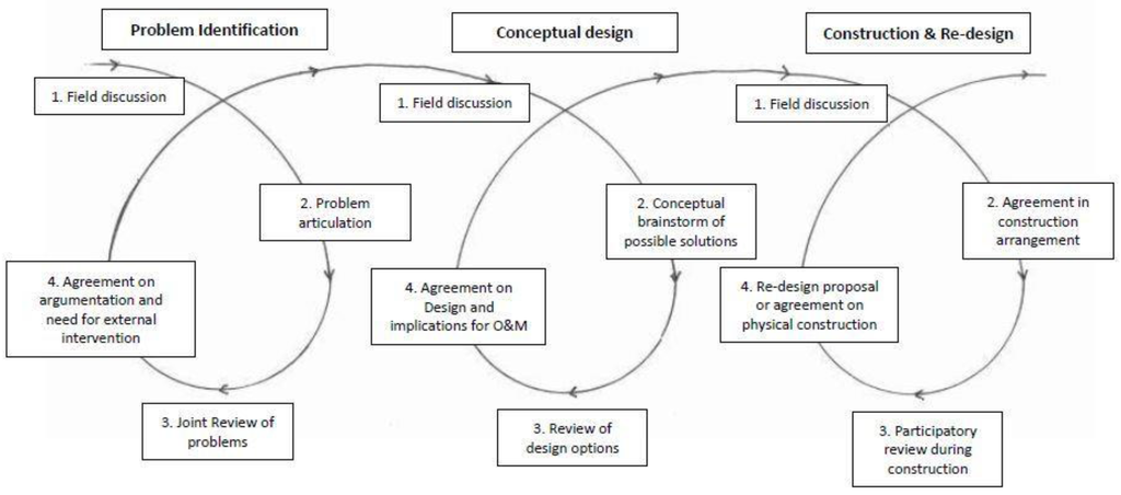 The PhD research done by Steven Scheer [24] in 1996 analyzes the design process and communication between engineers and farmers. He concludes that this communication is essential as a learning process for the engineer to capture the essential local knowledge on technical design issues and for farmers to understand the proposed production changes and how these will affect their institutional landscape. He proposes that the communication between engineers and farmers can be formalized in learning cycles with planned engagements between the groups around decision moments. In the case of Scheer, the planned engagements were formalized around discussion session based on scale models to discuss and visualize the technical operation of the irrigation system. The learning cycles consisted of the efforts by engineers to analyze and reinterpret the problem, adapt the design and model and then re-discuss the results in the next meeting. Meanwhile, the farmers would have discussions with their peers in the community, reinterpret their problem with the insights gained and redefine their solutions, which were then brought back into discussion in the next meeting. This circular process would continue until a feasible and desirable system was decided on and would be repeated again during the implementation and construction.