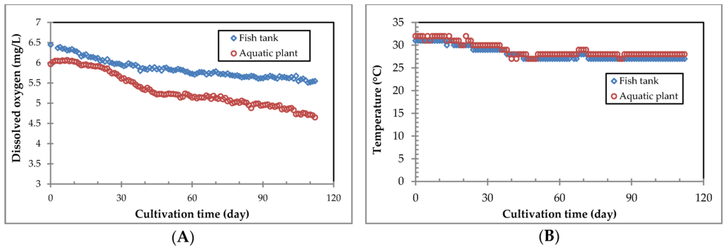 Dissolved oxygen (DO) gently decreased both in the fish and aquatic plant tanks. The initial DO concentrations in both tanks were 6.45 and 5.97 mg/L and the final concentrations were 5.55 and 4.65 mg/L, respectively (Figure 7A). In the fish tank, the reduction in DO would be due to a greater need for oxygen from the larger fish [46]. On the other hand, despite oxygen generated from photosynthesis, more oxygen was also required in the aquatic plant tank due primarily to the decomposition of uneaten feed and fish feces and nitrogen compounds through nitrification reaction. DO in the Chlorella sp. and Moina macrocopa tanks remained mostly unchanged (data not shown) indicating that the activities of the tank could be maintained regardless of the conditions in the other tanks.