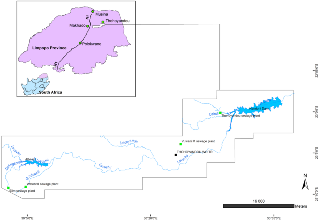 There are five sewage plants located upstream of the Nandoni dam; namely, Elim sewage plant, Waterval sewage plant, Vuwani oxidation ponds, and Vuwani and Thohoyandou sewage plants (Figure 1). The only exception here is the Elim sewage plant because it discharges the effluent into the Muhohodi River (Doringspruit) that flows into the Albasini dam situated upstream of the Nandoni dam.