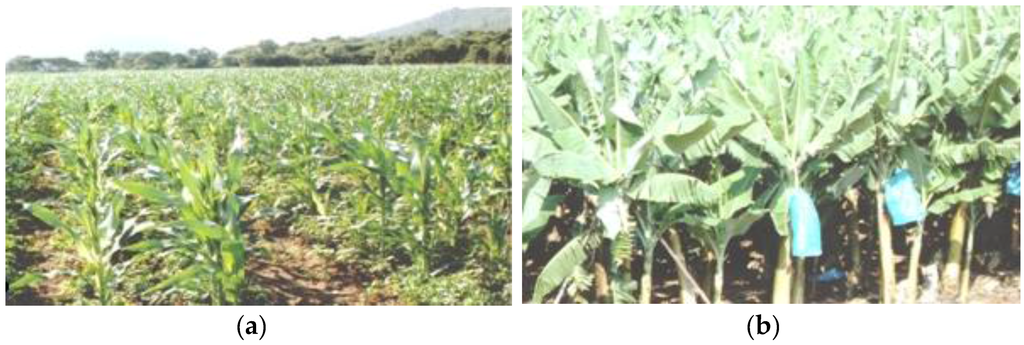 The practice of commercial agriculture: (a) maize growing and (b) banana plantations in the Levubu tropical area.