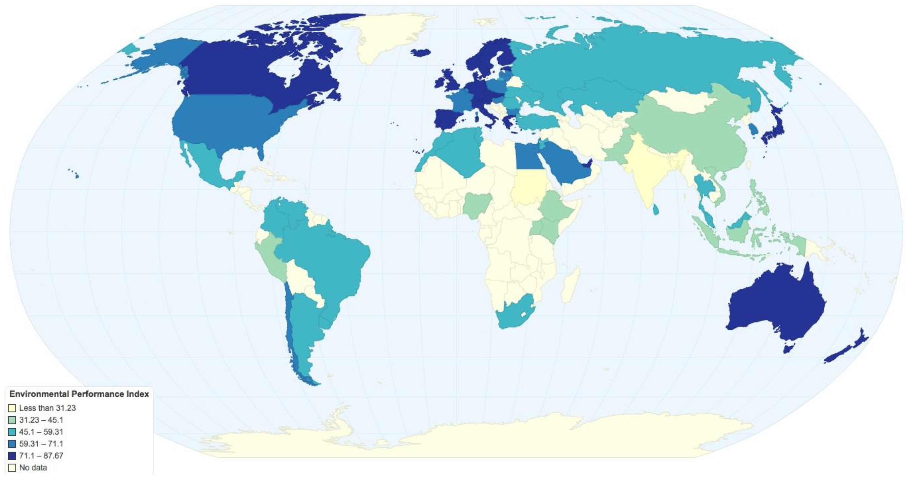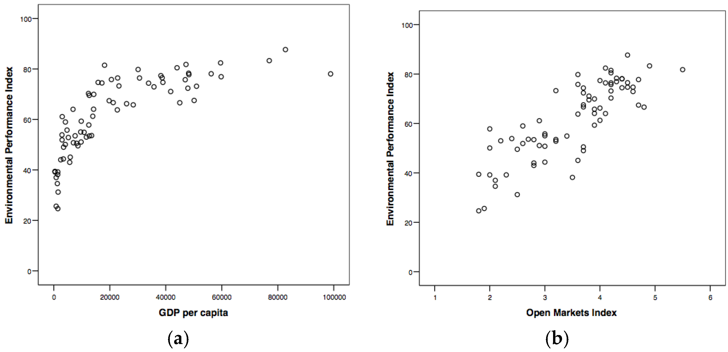 Based on the presented results, it is suggested that high-income countries with open market economies and high governance quality achieve higher environmental performance. Firstly, good governance is observed to be positively associated with economic development. Vogel [38] shows that the rich countries’ good governance plays a critical role in their environmental quality, as does the poor countries’ environmental quality, through market mechanisms that transfer environmental requirements to the latter. This, in turn, increases openness to trade, resulting in higher environmental protection. This is also confirmed by the ICC [25], supporting that the liberalization of trade has been of great importance to the improvement of life quality worldwide and, in order for “‘greener’ economic activities and policies to be adopted,” it needs to be further liberalized. Secondly, statistical significance between EPI and the openness of the economy is observed. Damaria et al. [39] identify stricter environmental regulations in countries with open trade. They also identify the critical role that the government’s corruption plays in environmental quality. Higher governmental corruption is associated with weak environmental regulation, mainly in closed countries. On the contrary, governmental corruption in open economies is restricted by trade liberalism, where environmental norms and standards are transferred from honest governments and environmentally sensitive countries with democratic values.