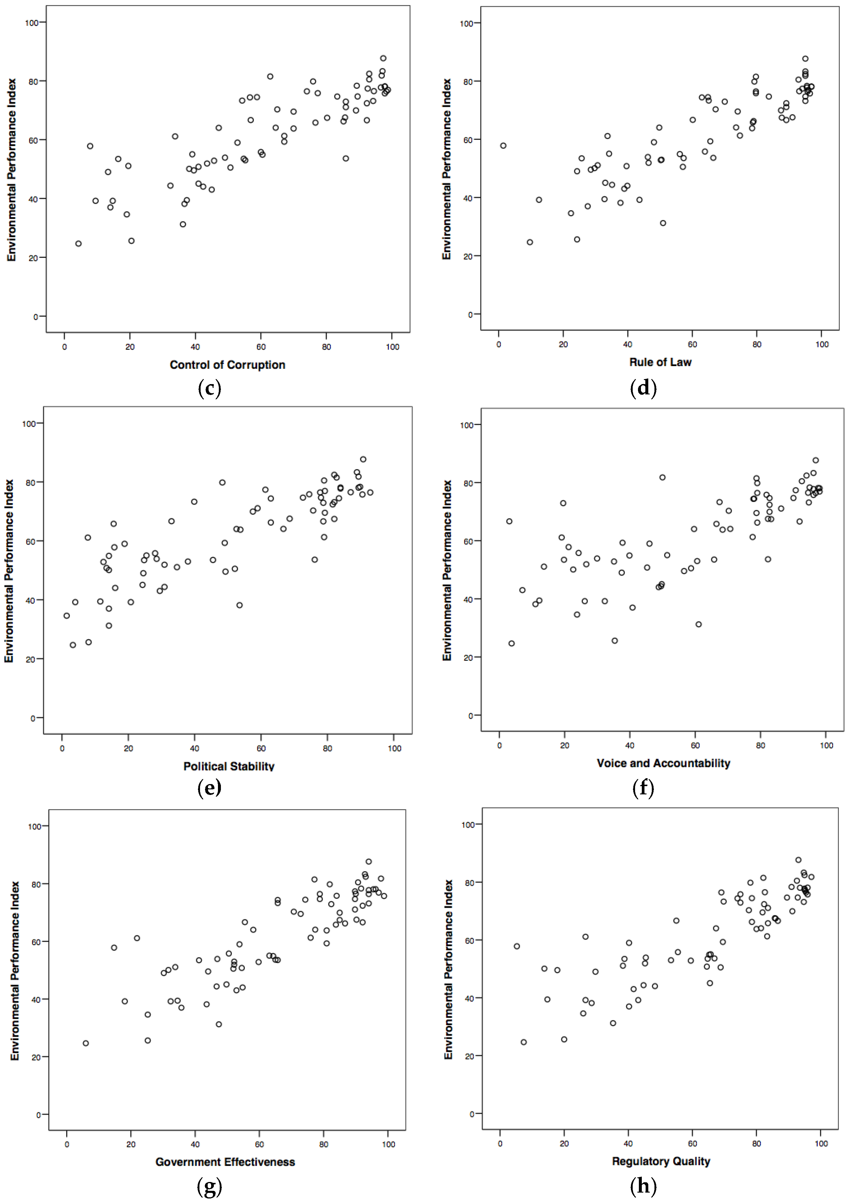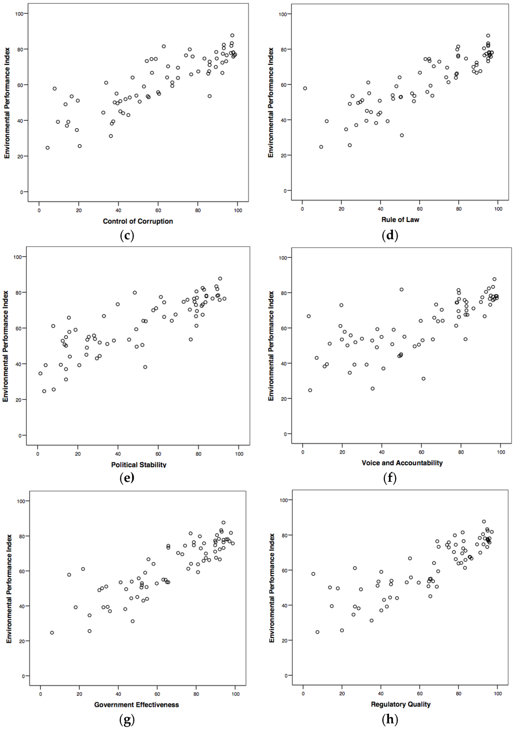 Figure 1 depicts the relations of EPI with GDPc, OMI, CC, RL, PS, VA, GE, and RQ. Figure 1a suggests that a country’s environmental performance increases up to a point as income per capita increases, and the relationship holds afterwards—in line with the Environmental Kuznets Curve hypothesis, i.e., that environmental degradation decreases as economic growth increases [31]. This implies that higher economic growth provides the essential conditions for environmental protection due to the fact that rich countries have higher levels of educated citizens who demand better environmental and healthy living conditions and the establishment of environmental standards for industry operation [32]. This actually integrates institutional aspects in a market economy and indirectly indicates key factors that play a critical role in the environmental protection of economically developed countries. OMI positively correlates with EPI as well (Figure 1b), overall suggesting that economic development positively affects environmental performance. This is confirmed by relative literature suggesting that the openness of an economy plays an important role in developed counties [33] through raising foreign direct investments and liberalizing the financial and capital markets, and an open economy seems to assist countries with the reduction of CO2 per capita [34]. Frankel and Rose [35] illustrate that the effects of trade and growth on air pollution (e.g., SO2 and NO2) is good enough, while the openness of the economy and CO2 emissions do not have a good relationship.