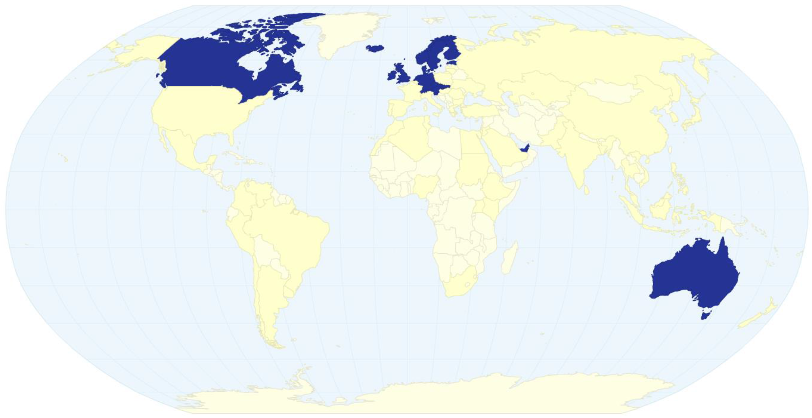 The countries with an OMI score above 4, i.e., countries in the groups “excellent” (5–6) (only Singapore) and “above average” (4–5), are 27 in total (37% of our sample). When this list is cross-referenced with the one consisting of the 27 countries scoring the highest in EPI, the set of the following 19 countries is obtained: Australia, Austria, Canada, Czech Republic, Denmark, Estonia, Finland, Germany, Iceland, Ireland, Luxembourg, Netherlands, Norway, Slovac Republic, Slovenia, Sweden, Switzerland, United Arab Emirates, and United Kingdom. Figure 2 and Figure 3 show the countries’ scores in OMI and EPI, respectively, and the 19 cross-referenced countries are presented in Figure 4.