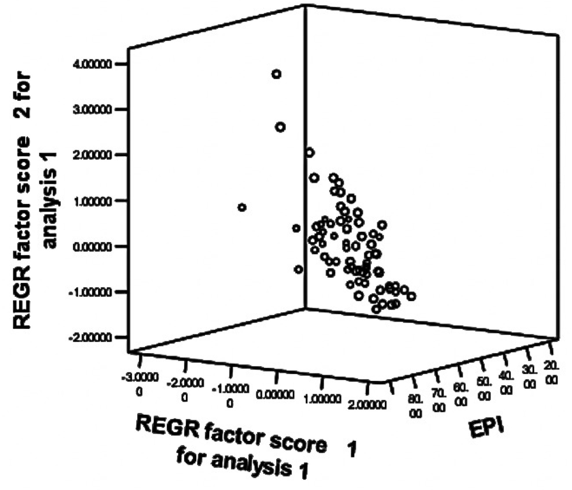 Figure 5 shows the scatter diagram of the factor analysis. EPI is associated with the z-axis, and Factor 1 and Factor 2 with the x-axis and y-axis, respectively.