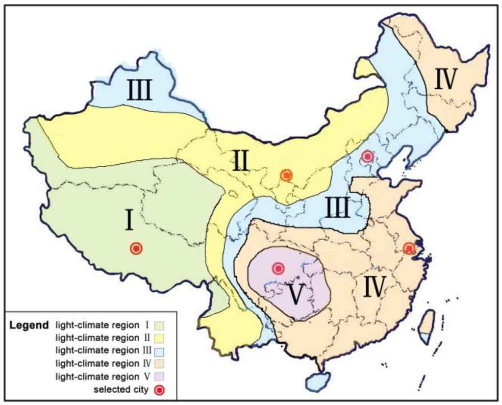 As mentioned above, there are five light-climate regions in China. In order to compare climate-related differences, five cities were selected from each light-climate region: Lhasa (Region I), Yinchuan (Region II), Beijing (Region III), Shanghai (Region IV) and Chongqing (Region V) (Figure 1). Each of these cities is the capital of its province and has a population in the millions. The map of the division of the light-climate regions in China with the five representative cities indicated is shown in Figure 1 while these cities’ geographical information is listed in Table 1.