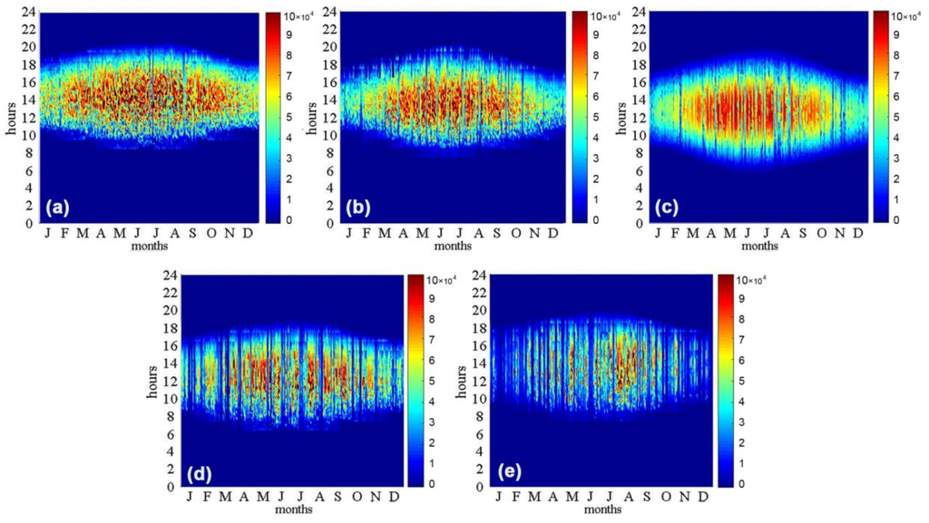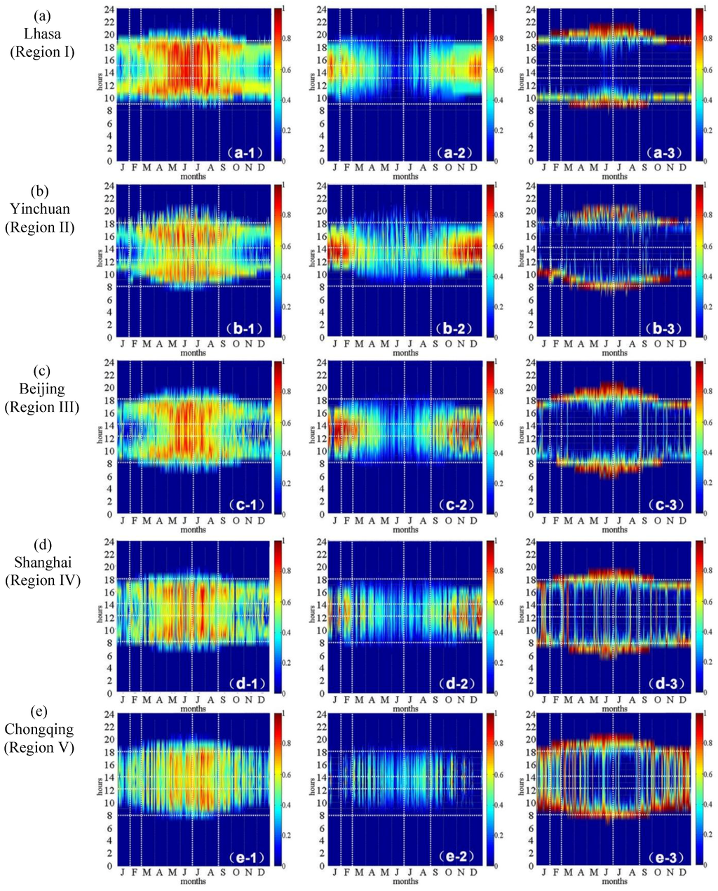 Temporal maps of the five cities were drawn with the exterior annual horizontal illuminances calculated by Daysim in five-minute intervals. The annual data were presented on surface maps, in which the hours of the day are shown in the vertical axis and the days of the year are shown in the horizontal axis. As shown in Figure 2, these maps are quite different under the same color bar of illuminance set from 0 to 10 × 104 lx, corresponding to the colors from blue to red. Maps of Lhasa, Yinchuan and Beijing (Region I, II and III) were redder in color, indicating higher levels of solar illuminance, while the maps of Shanghai and Chongqing (region IV and Ⅴ) were bluer, meaning lower daylight intensity.