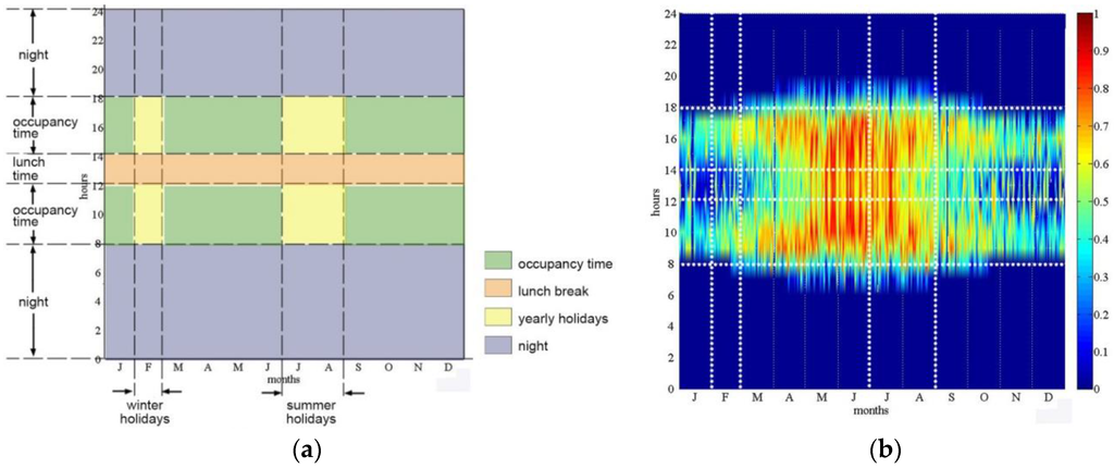 In China, students have three months off per year: February, July and August, and daily academic schedule is from 8:00 a.m. to 6:00 p.m. (excluding lunch break from 12:00 p.m. to 2:00 p.m.). Time segments of yearly holiday and daily lunch break were marked with dotted line on the temporal maps in this paper. The diagram of occupancy and unoccupied time is shown in Figure 4a and an example of a temporal map with occupancy time marked is shown in Figure 4b. The designer may ignore the marked time segments and concentrate on the daylighting information within the occupancy time. In this article, the data in unoccupied time were marked rather than deleted because in that way the integrity of the annual distribution feature can be retained and benefit the designer making an overall analysis and rational policy.