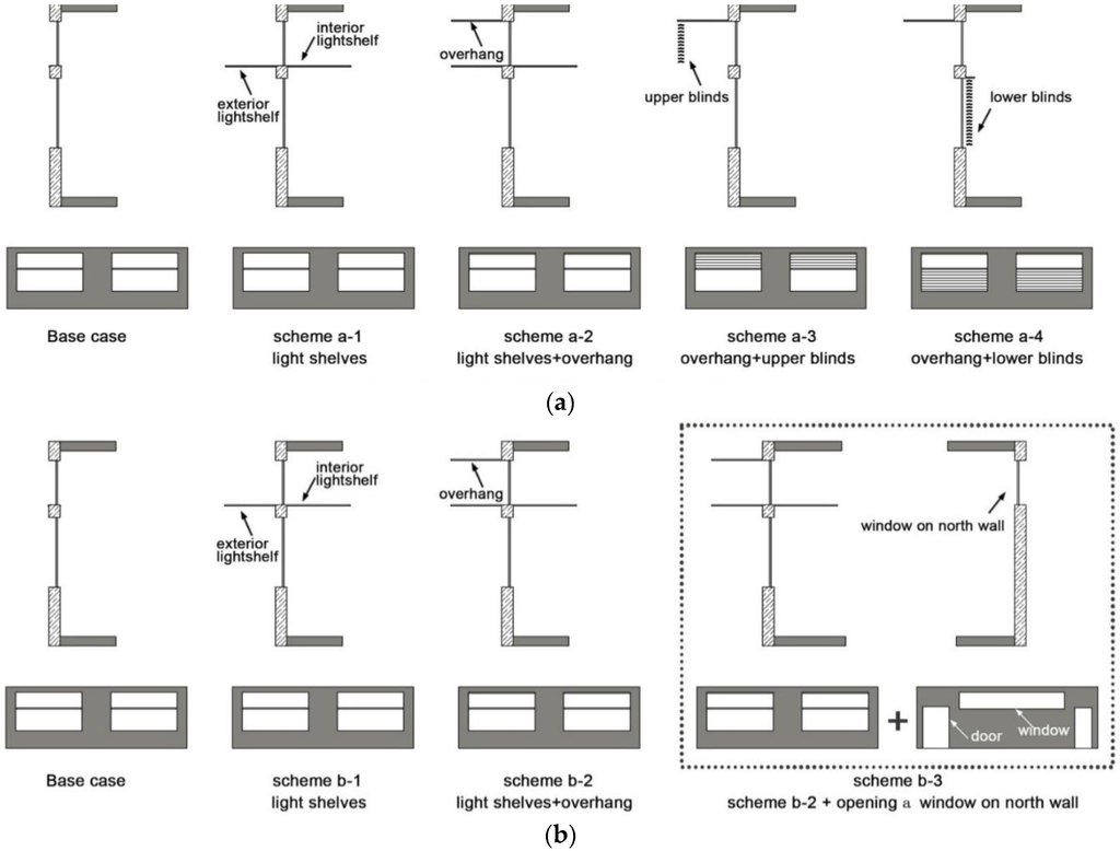 Daylighting strategies compared in different light-climate regions. (a) Straegies for light-climate regions 3–5; (b) Straegies for light-climate regions 3–5.