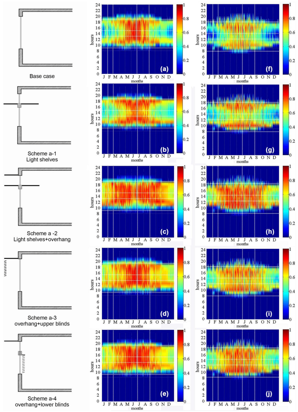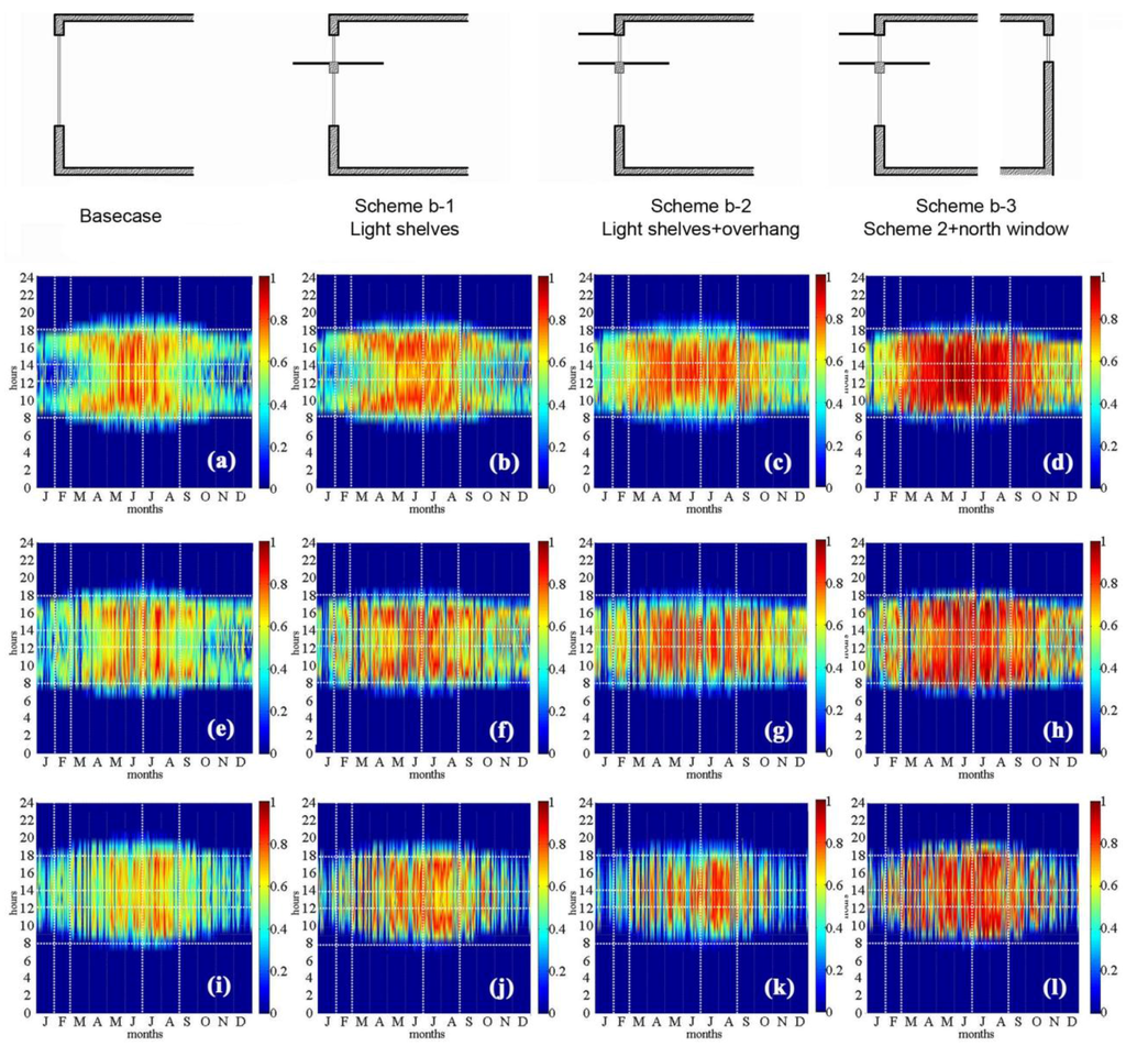 The four passive architectural strategies and their “in range” temporal maps are shown in Figure 7. Compared to the base case, daylighting performances under the four new schemes were all improved. There were more areas in red color and less areas in blue. The scheme of “light shelves +overhang” (Scheme a-2) performed the best. Under the condition of scheme a-2, the temporal map of Yinchuan (Figure 7h) was red from March to October. It showed that nearly 80% of the spatial area achieved its daylighting objective. The situation was a little worse from November to February when the ratio of fulfillment in the acceptable range was about 50%. As February is in the winter holiday in Chinese school, the scheme a-2 of “light shelves + overhang” achieved a satisfactory outcome. Specifically, those three months (from November to January) scored 50% of spatial area reaching the daylight requirement and the rest months mostly scored 80%. The low ratio of area fulfill threshold mainly occurred in the early morning and late afternoon, when the sun is near the horizon. Most regions in China adopt the Beijing Time, which is about one hour early than the solar time of Yinchuan. The temporal map showed that before 10:00 am from November to February and before 9:00 am from March to October, the daylight performance was poor and artificial lighting was needed to improve the indoor lighting quality.