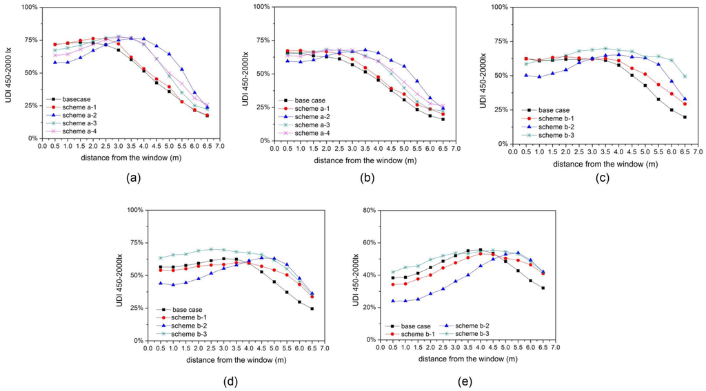 Besides the high ratio of area researching illuminance threshold, the uniform distribution of daylight is equally important to the quality of indoor environment. An ideal lighting environment should provide better illumination distribution and increase the homogeneity of daylight into the space [45]. Therefore, we added the analysis of UDI450-2000lx at different distances from the window for base case and the optimal architectural strategies. As shown in Figure 8a,b, comparing to base case, four passive designs all decrease the UDI450-2000lx levels in the first few meters in front of the window while enhance the daylighting in back of the room. The maximum level of UDI450-2000lx occurs at 2 m, 4 m, 3 m and 3 m away from windows for scheme a-1 to a-4 respectively. It can be seen that the scheme a-2 allows a more homogenous distribution than other schemes, especially enhances the UDI450-2000lx levels far away from the window.