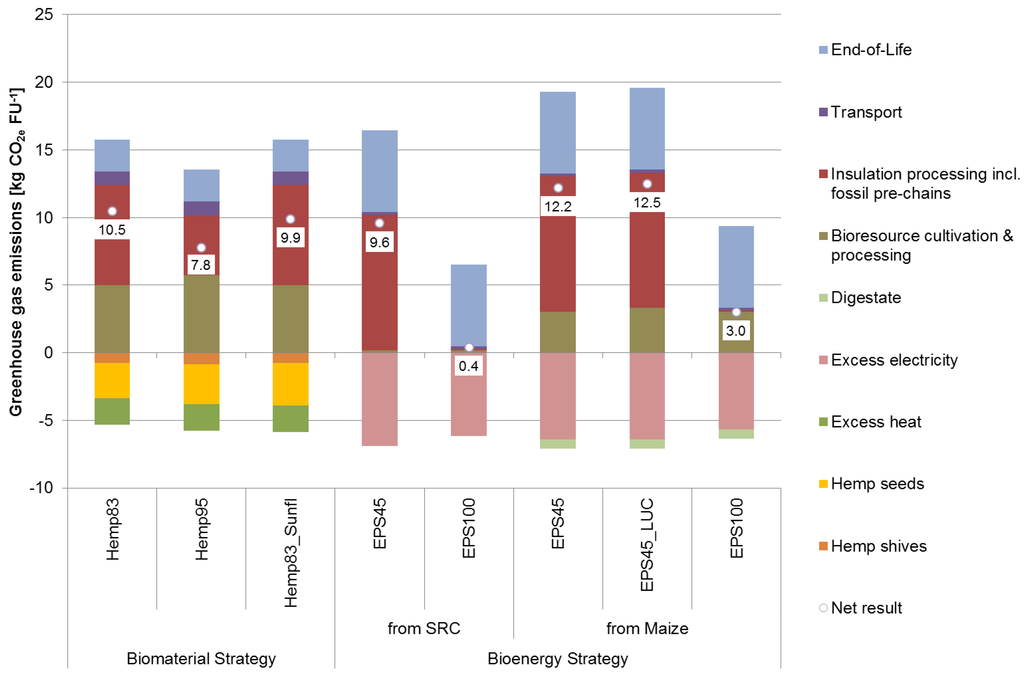 For bioresource-based insulations in the biomaterial strategy, explicit data on hemp recycling are scarcely available and thus, we did not assess recycling here.