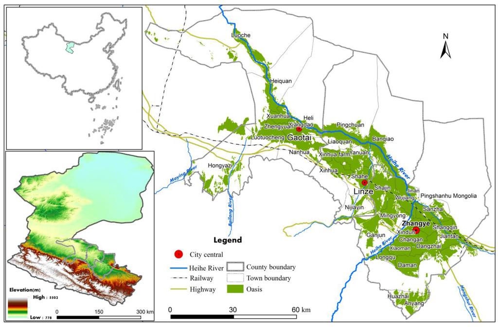 The study area is located in the middle basin of the Heihe River, Gansu Province, which lies in the arid climate zone of Northwest China, between 98°57′–100°52′E and 38°32′–39°42′N. The study area encompasses Ganzhou, Linze, and Gaotai and has a total area of 10,500 km2 (Figure 1). The mean annual precipitation in the area is 62–156 mm, and the annual evaporation is 1000–2000 mm. The Heihe River is the only surface runoff. From south to north, the topographic features successively consist of the piedmont alluvial fan, the corridor plain, and the Gobi desert. The oases are mainly distributed within the corridor plain. They account for 26.07% of the entire study area and 38% of the oasis area of the entire Heihe River basin. In 2014, RSL accounted for approximately 5.89% of the total oasis area (according to the results of this paper), whereas the 2014 population in the study area was 791,800, corresponding to approximately 42% of the total population of the Heihe River basin. The urban population was 326,200 and the RRP was 465,600, thus accounting for approximately 61.43% of the total population. Farmers’ net income per capita amounted to approximately $1341.00—considerably higher than the average ($776.41) for Gansu Province [20].