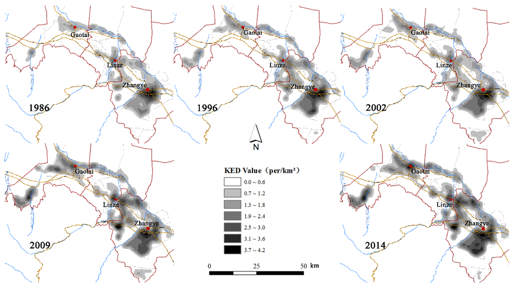 As shown in Figure 5, the RSL patches were clustered close to the urban region of Zhangye in 1986 but expanded to the peripheral regions of the urban areas and along both sides of the rivers and roads from 1996 to 2004. Ultimately, all of the RSL patches had clustered, forming four clustered districts: Zhangye, Linze, Gaotai, and near both sides of the Heihe and Bailiang Rivers. The RSL density showed a significant decrease from the surroundings of the cities to remote villages, gradually forming a hollow in 2014, as observed in Figure 5. In general, RSL initially developed near urban areas and along the rivers and, then extended to peripheral regions and along the main roads.