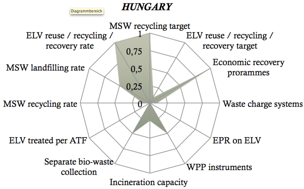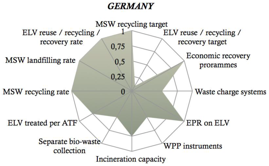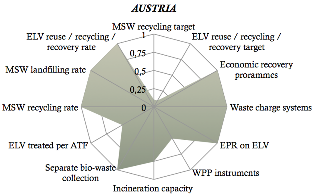 The approach distinguished two pillars: the policy and institutional factors, such as economic incentives and waste programmes assumed to be influencing the technical set-up and infrastructures in the waste sector. Both aspects were analysed with regard to different dimensions and indicators, such as targets (i.e., Municipal Solid Waste (MSW), End-of-Life Vehicles (ELV) targets), the regulatory framework conditions (i.e., the existence of waste prevention programmes, the number of waste management plans or concepts, the existence of specific waste laws, e.g., biogenic waste, the country specific waste charge systems, the Extended Producer Responsibility (EPR) schemes, and potential Waste Prevention Programme (WPP) instruments), the existence of an agency for waste issues, and further relevant policy instruments (i.e., economic recovery programmes addressing waste issues). The technical system was examined by comparing the country specific MSW incineration capacities, the access to separate bio-waste collection systems, the ELV per authorized treatment facilities (ATF), the MSW recycling rates, the biodegradable MSW landfilling rates and the ELV rates.