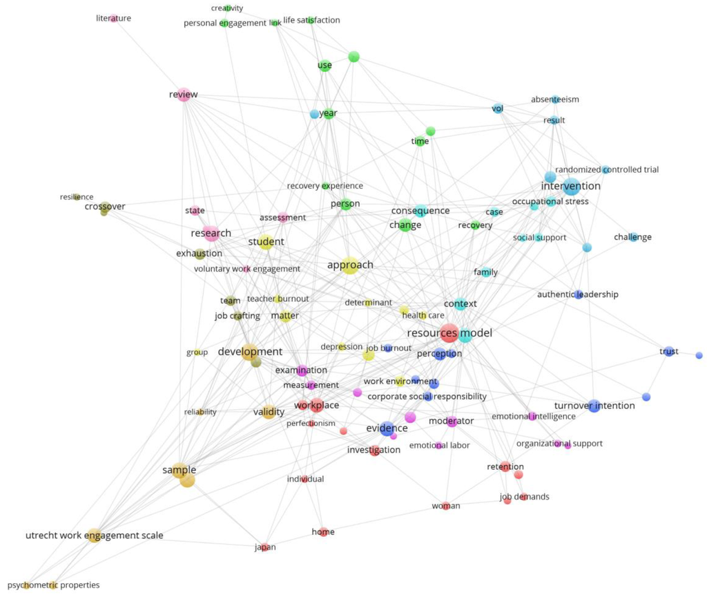 Based on co-occurrence relationships, these 100 words are grouped into 10 clusters as represented by the colors of the nodes with each cluster consisting of related issues. Cluster 1 (red nodes) is dominated by resources model and work place. In Cluster 2 (cyan nodes), the major keywords were context, family and social support. In Cluster 3 (green nodes) person, change, time and year were important. In Cluster 4 (yellow nodes), student, approach, and teacher burnout were significant. In Cluster 5 (brown nodes), development, validity, sample, and Utrecht work engagement scale were important. In Cluster 6 (blue nodes), turnover intention, corporate social responsibility, evidence, and perception were dominant. In Cluster 7 (light blue nodes), intervention and result were important. In Cluster 8 (dark brown nodes), team and job crafting were most important. In Cluster 9 (pink nodes), research, assessment, and review were important. Finally, in Cluster 10 (purple nodes), moderator, examination, and measurement were significant.