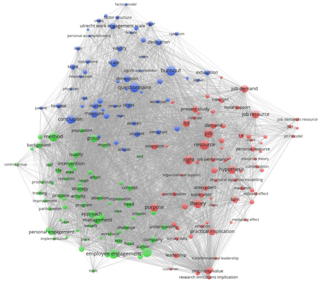 In Figure 2, the 200 keywords were grouped into 3 clusters. In Cluster 1 (red nodes), the most significant abstract key words were hypothesis, resource, job resource, job demand, and practical implication. In Cluster 2 (blue nodes), questionnaire, burnout, Utrecht work engagement scale, measure, scale, and nurse were important. Finally, in Cluster 3 (green nodes), employee engagement, management, personal engagement, method, and intervention were dominant.